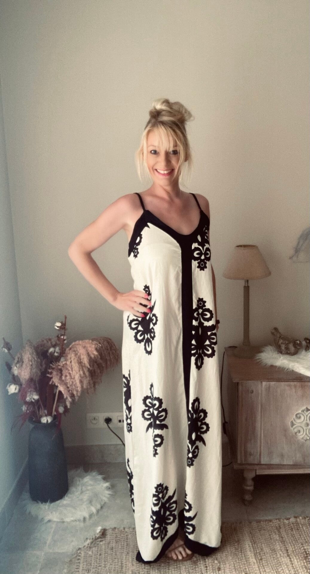 Losvallende maxi jurk in créme kleur met zwarte accenten. De jurk is one size en kan zeker gedragen worden tot maat XXL