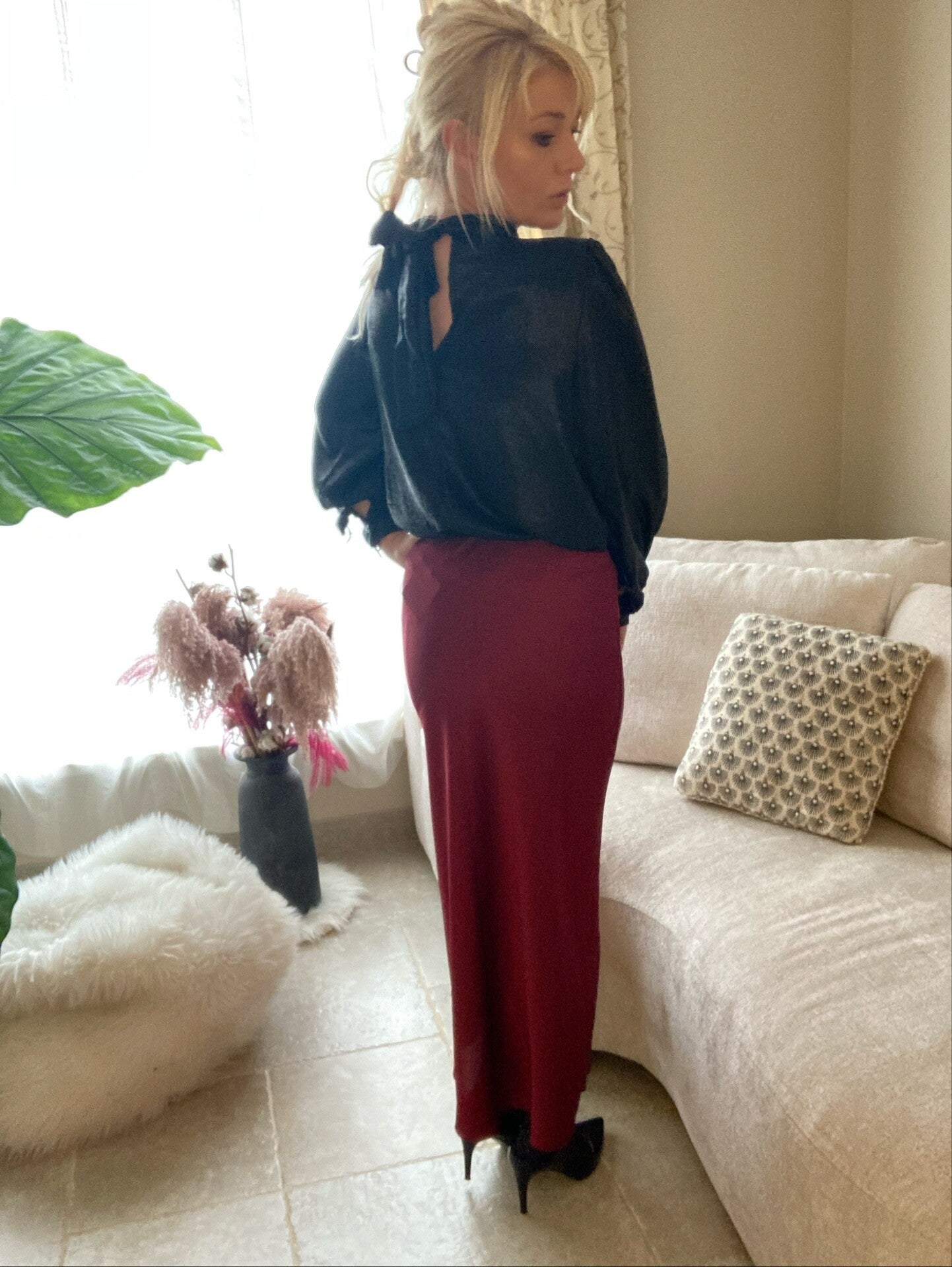 Blouse (zonder knopen) gestrikt op de rug. De blouse is 1 maat en kan gedragen worden tot maat M/L