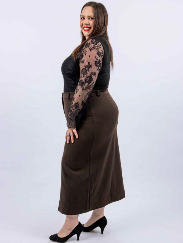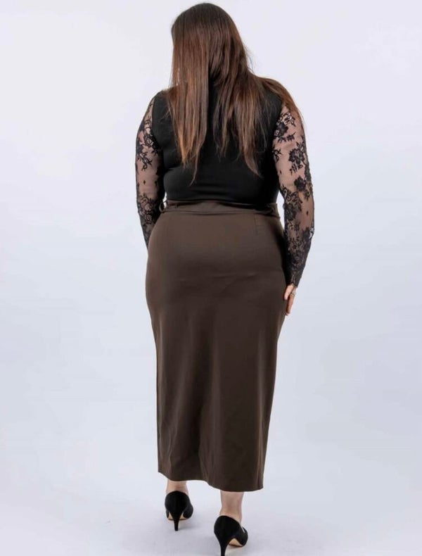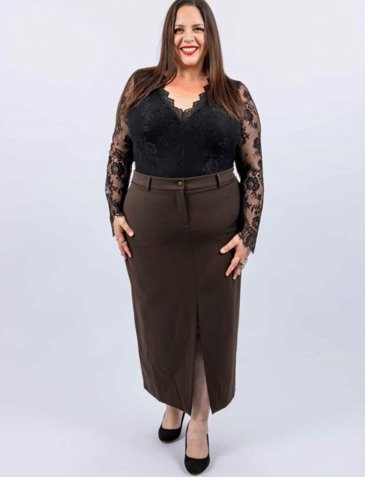 Bruine rok met split, recht model. De rok is beschikbaar vanaf maat XL t.e.m. maat 4XL De rok is voorzien van stretch.