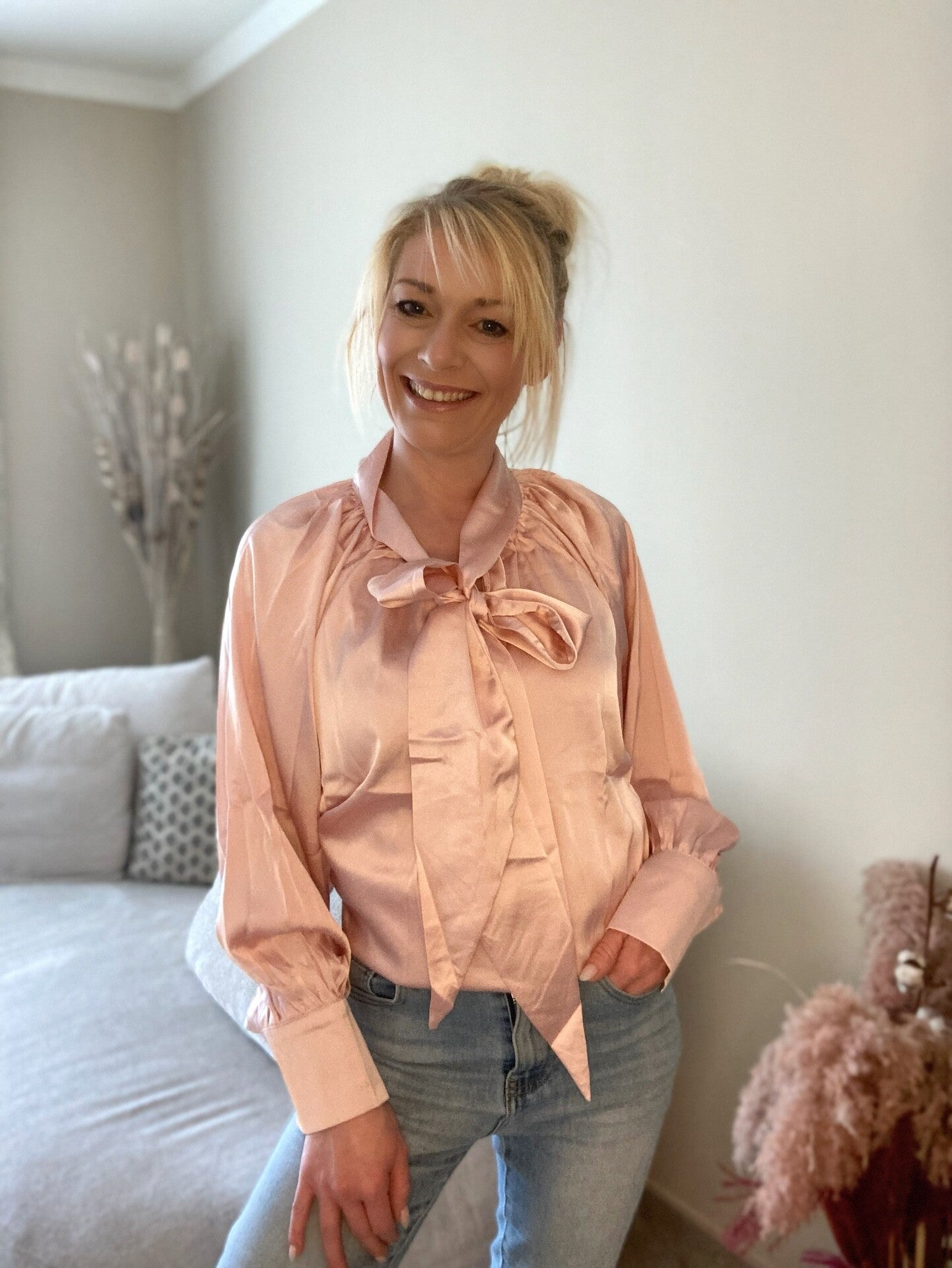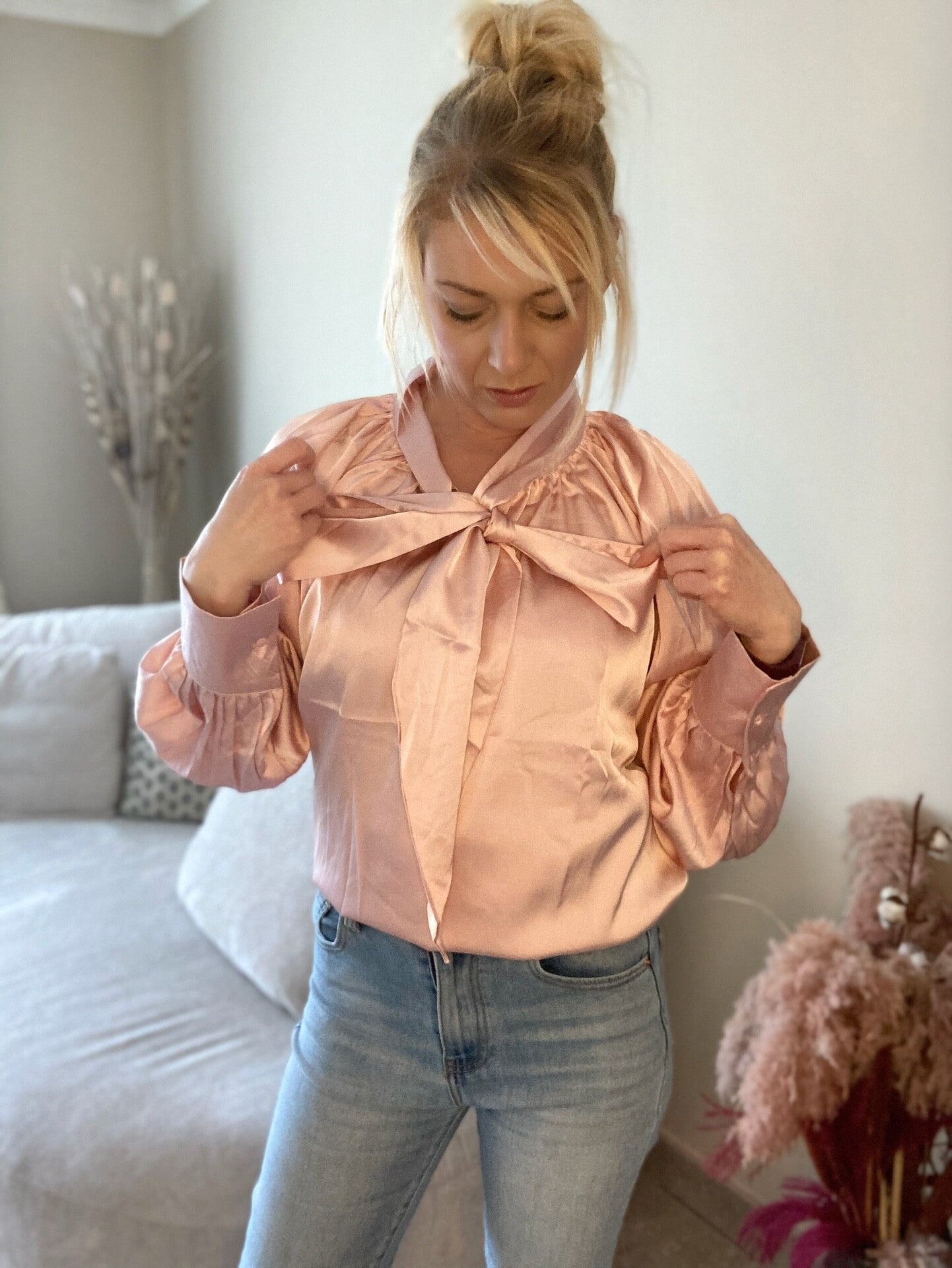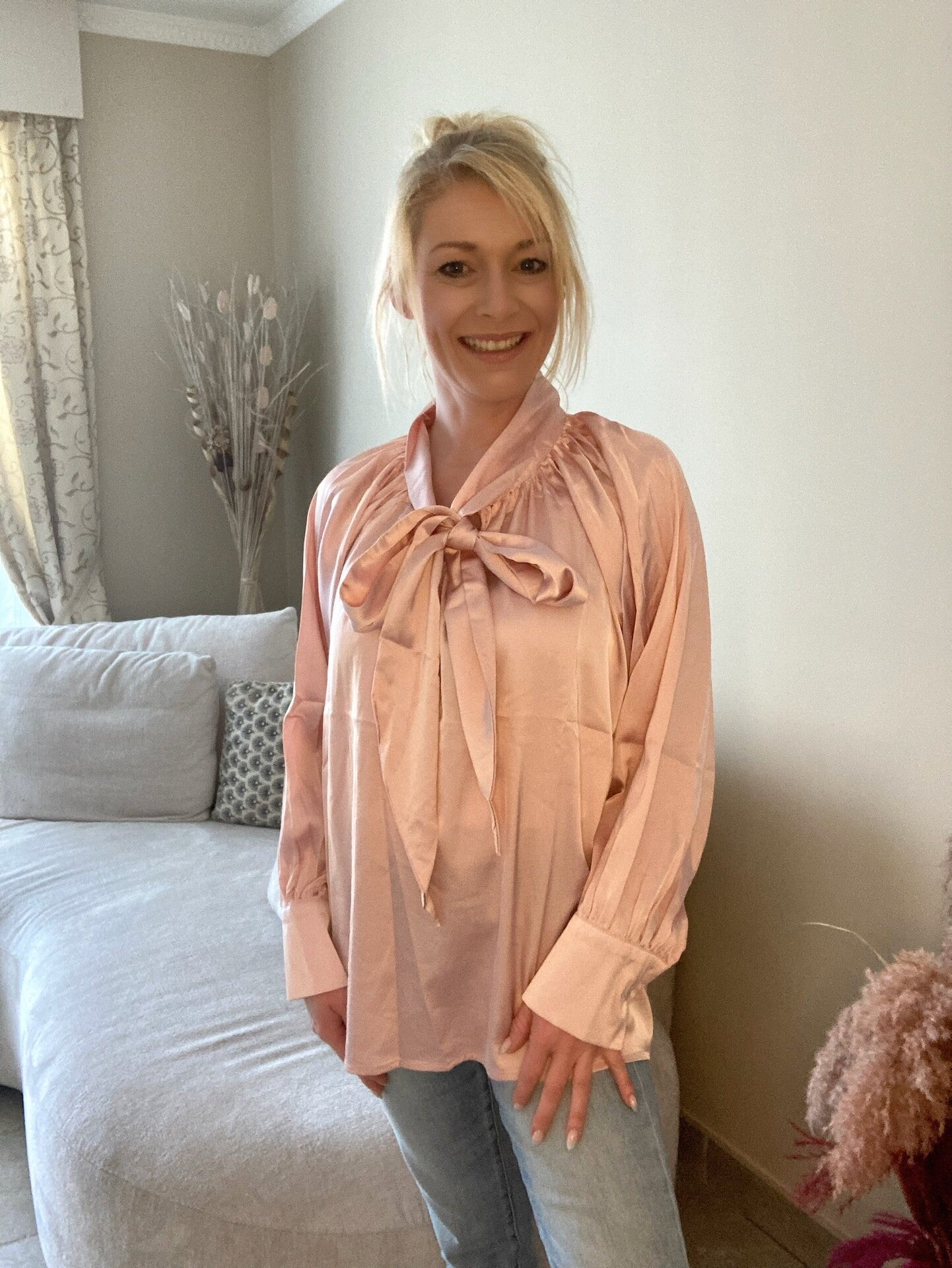 Blouse in satijnlook met gestrikte hals. De blouse tailleert eerder los. Beschikbaar in maat S/M en M/L