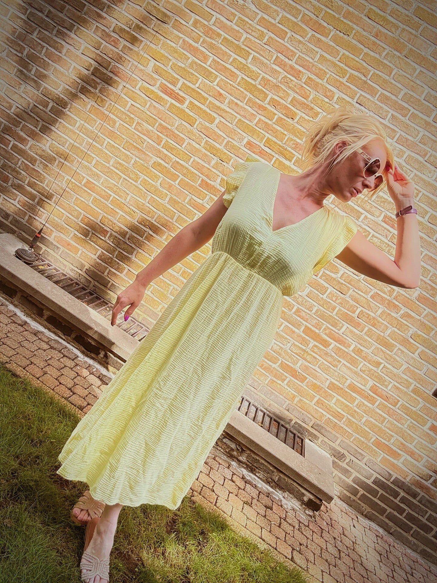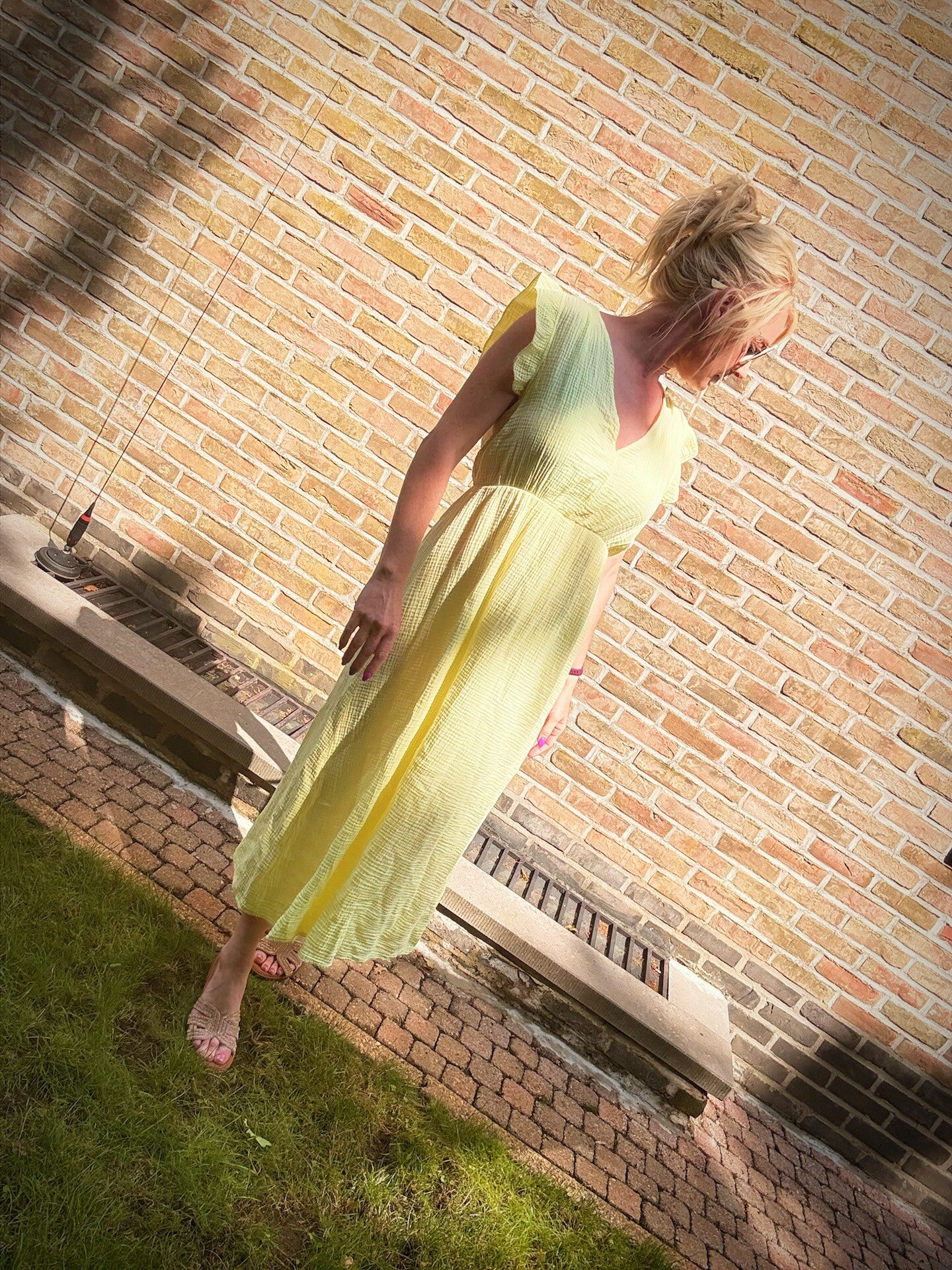 Zachtgele jurk in tetra stof. De jurk is aan de schouders mooi afgewerkt. Ze is voorzien van een rekje, dit zorgt voor de ideale pasvorm. De jurk is 1 maat, maar valt los door. Ze kan zeker gedragen worden tot maat XL