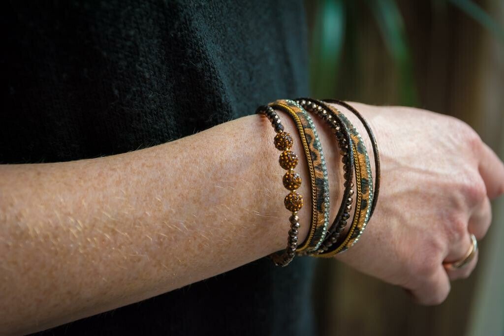 Het lijkt alsof je verschillende armbanden in dezelfde tinten draagt.