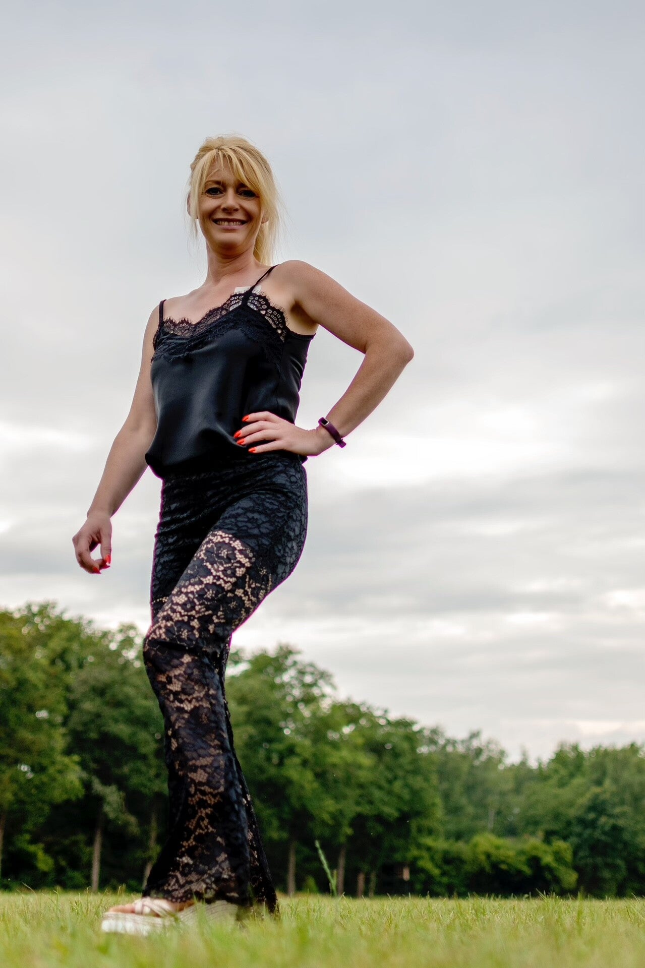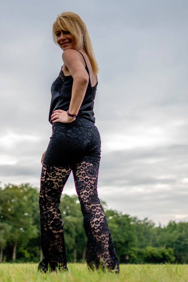 Topje afgewerkt met kant en v-uitsnijding op de rug.